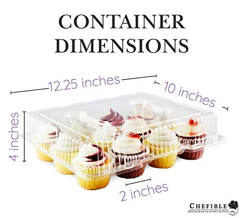 - CONTAINER DIMENSIONS: 12 15/16 x 10 1/4 x 3 3/8 Inches, Bottom Compartment Diameter 2 Inches. Container Holds 12 Cupcakes.