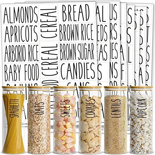 - Self-Adhesive: The self-adhesive pantry organization and storage labels are preprinted on transparent water-resistant vinyl that can easily be removed or replaced if needed; ideal for large glass canisters with lids