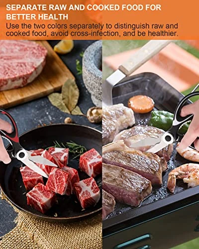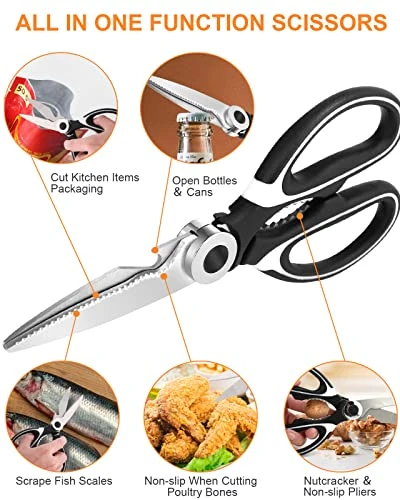 STAINLESS STEEL SHARP BLADES: High quality hardened stainless steel blades easily cut through cardboard, twine, food, meat, vegetables, chicken, poultry, fish, herbs, seafood, BBQ, food packing bags and more. Great as Food Scissors, Meat Scissors, Cooking Scissors, Kitchen Scissors, Cooking Scissors, Poultry Scissors, Utility Scissors, Meat Cutting Scissors.