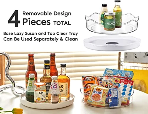 - [Fashion Design] Our lazy susan organizer appearance designed look like a tulip, The edge of it is designed with wavy lines, It is very elegant and beautiful. Clear high-edge removable tray and rotating base lazy susan, combined together, simple, natural and stylish. which meet your organize needs while decorating your room, bathroom, kitchen and countertops