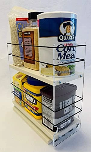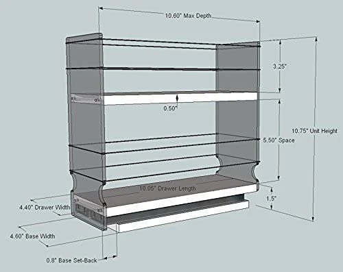 - SIZE: 10.60″ deep x 4.6″ wide x 10.75″ tall. DEPTH = back of the cabinet to inside the closed door. WIDTH = between the hinges. HEIGHT = depends on your containers, top tier is 7.5″ from the base.