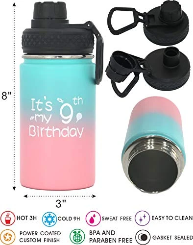- 9 Year Old Gifts Water Bottle: The 9th Birthday Water tumbler are made of unbreakable 304 18/8 food grade stainless steel and the lid with a drinking strewing hole are made of ABS and Silica gel, also easy to clean with warm water. In details, 9th Birthday Water tumbler are able to keep your water icy-cold for 9 hours or water scalding-hot for over 3 hours.