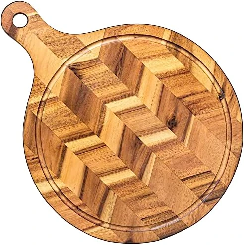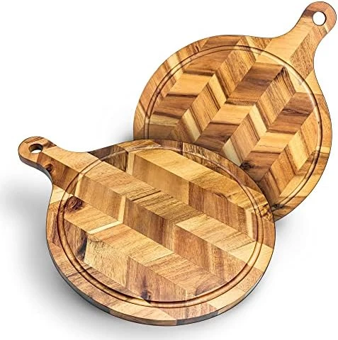 - ✅ LONG, ERGONOMIC CARRY HANDLE: This round acacia wood cutting board is equipped with an easy-to-grip carrying handle that makes it easier to move between your kitchen and dining room, or even out to your patio by the grill, so you can serve food effortlessly.