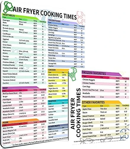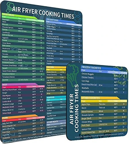 - Air fryer accessories: Each pack comes with 2 cooking time cheat sheets for air fryers that show the Cooking Time, Temperature, and Size of food to take the guesswork out of cooking, so you don’t have to waste time looking things up