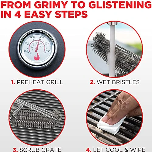 - EASY TO USE GRILL GRATE BRUSH: Effortlessly clean your bbq in seconds with a grill scrubber designed for the ultimate clean; the days of slaving over a dirty grate while your friends and family enjoy the party are over. With 3x the surface area of a standard grill brush, packed full of rust proof stainless steel bristles, you’ll be done in a flash.