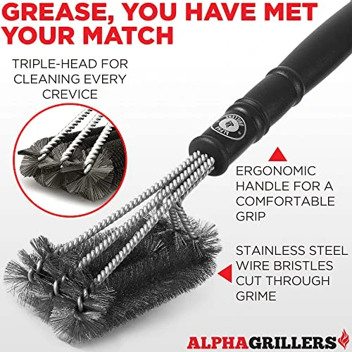 - SAFE GRILL CLEANING BRUSH: Safe grill brush for gas grill cleaner, porcelain, stainless steel, & cast iron grills. You want a brush that’ll get your grill looking good as new, but don’t want to risk damaging your expensive grates; the Alpha Grillers barbecue brush has got your back; our extra thick bristle design will work perfectly on all grate types.