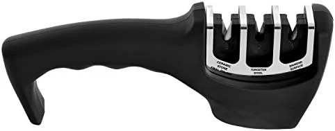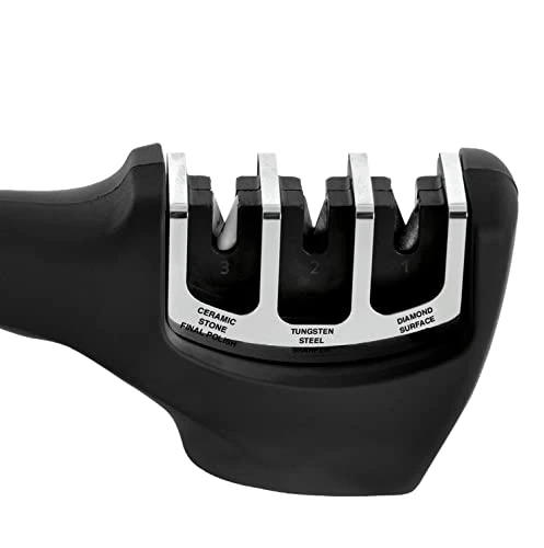 - Sharpens your knives in 3 simple stages. Ergonomically designed handle for a firm and safe grip. Anti-skid base is to prevent movement on your countertop and ensures a good grip.