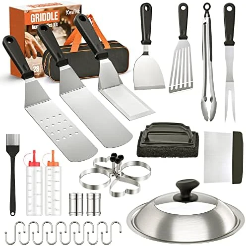 - 【Perfect Complete Set】This griddle accessories kit includes: 2* oversized spatulas, 2* barbecue spatulas, 1* graduated chopping scraper, 2* sauce bottles, 1* cleaning spatula, 1* cleaning brush, 1* dry pan tong, 2* egg rings (3.5″), 1* Pan lid,1* carrying bag.