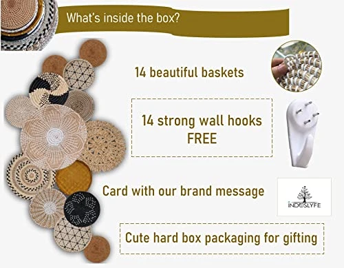 - Boho home decor: 14 high quality African wall baskets and 14 wall hooks, come packed in a well-designed gift box. You can put them all on a large wall, a living room or bedroom or spread across many rooms for a complete boho home decor. All of them complement each other beautifully