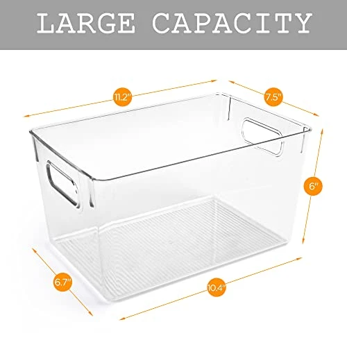 - VERSATILE: LotFancy clear plastic storage bins measure 11.2”×7.5”×6” – for fruits, veggies, packaged goods, yogurts, canned goods, drink boxes and more; Suitable for kitchen, pantry snack organizer, cabinet storage organizer, cupboard, closet, craft room, laundry/utility room, bathroom, office, playroom and more