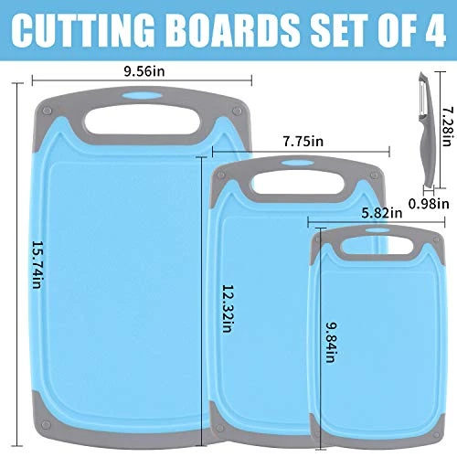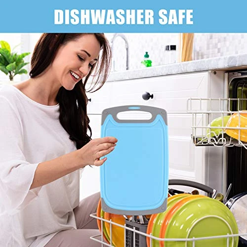 - 🥕NON-SLIP & JUICE GROOVES: equipped with four nonslip rubber feet on bottom, these plastic cutting boards is much safer for you to cut on. The deep juice groove collects excess liquids, preventing spills.