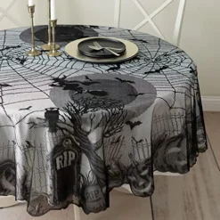 Spooky Spirits Web Lace Fabric Halloween Tablecloth, Halloween Table Cloth (Black, 70″ Round)