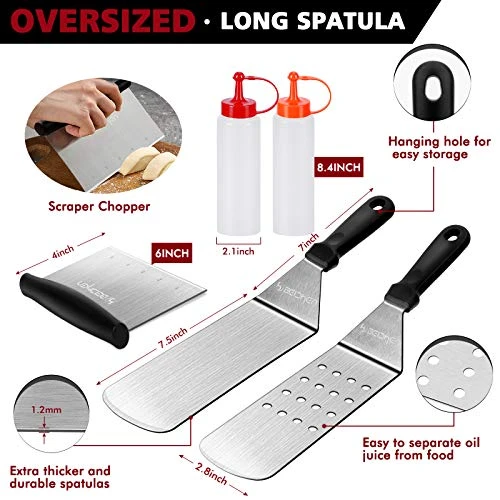 - 〔Necessary Griddle Tools〕Scraper, spatulas, and oil bottles are necessary griddle spatulas for flat tops. Griddle spatula can move large amounts of food quickly and accurately. Chopper/scraper to dice food and scrape griddles clean. The bevel turners/tapered spatula well handle your dicing needs and grill cleaning. The egg rings and other BBQ tools will help you perform well in barbecue cooking.