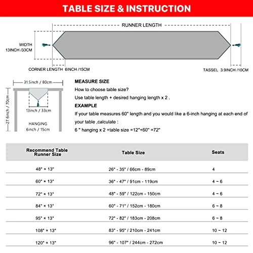 - Runner Size: 60×13″, table runners 60 inches long recommended use for length of table’s size: From 37 – 47 Inches.