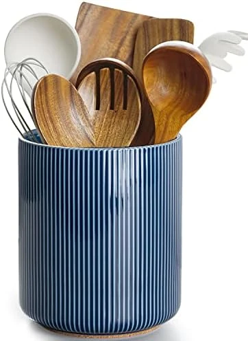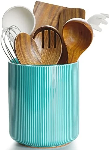 - [Stable & Durable Utensil Crock] Made of premium ceramics, this ceramic utensil holder is clearly heavier than ones made of other materials, steadily stands on your countertop; Glossy glaze & durable material, withstands long-time daily uses