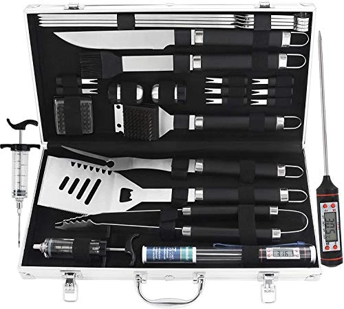 - Convenient Storage — The Velcro locks each tool in a neat position, you could easily keep all the barbecue tools in the portable aluminum case. The lightweight aluminum case is easy to carry which is ideal for camping or picnic.It is a perfect gift for Father’s Day, birthdays, Christmas, wedding and housewarming.