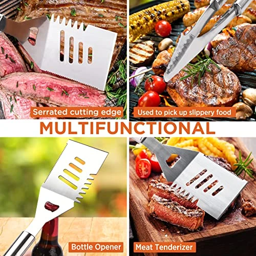 - ✅ GREAT BBQ GRILL ACCESSORIES – Not only does it come with all necessary tools like spatula, tongs, grill fork, grill brush, and meat thermometer, but it also comes with basting brush that is up to the task of getting this job done quickly and efficiently.