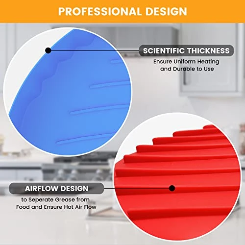- 🍕【Science-based design with Upgraded Groove Design and Professional Thickness】A silicone liners for air fryer basket which is too thick will affect the heating and taste of the food, and too thin will be melt. After times to times trials, we make the most suitable thickness to ensure both the uniform heating and durable to use. At the same time, with upgraded groove design, it can seperate the residual oil or grease from the food , to ensure better tasty food.