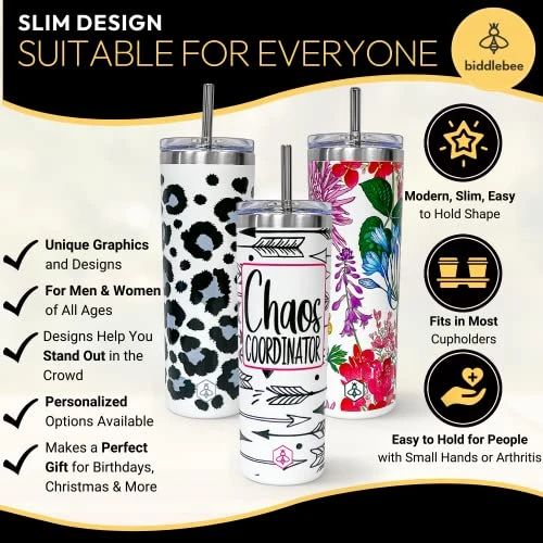 - Premium Printed Skinny Tumblers: The choice is simple – Biddlebee cups with lids and straw are a stand out in any crowd! Why settle for plain, boring solid colored cups .. you deserve better. Our designs feature 360 degree prints that you can actually feel! The Biddlebee travel tumbler is stylish and functional.