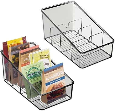 - COMPACT DESIGN: The compact design of this storage container easily fits into small or crowded kitchen cabinet and pantry shelves; The sloped design and 4 divided sections, makes it easy to see and grab what you need, right when you need it; Use multiples side-by-side to sort and store small items and sundries; Mix and match with other coordinating kitchen and pantry organizers from mDesign to create a complete organizational system for your home
