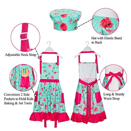 - 🌟【Ideal Kids Gift】: MHJY cute apron with chef hat is perfect for kids girls to study cooking, baking, painting, gardening, doing housework. Great theme party and chef roly paly costume,halloween costume,wonderful birthday,Christmas gifts for your girls.