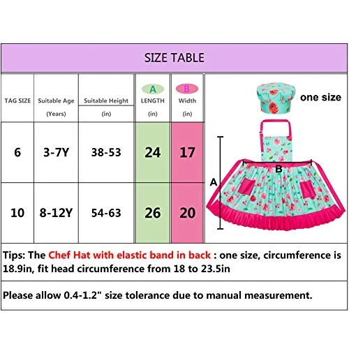 - 🌟【Child Aprons Sizes】: 2 Sizes available: Small-recommend for girls age 3-7 years; Large-recommend for age 8-12 years. One Size Chef Hat with elastic band in back, comfortable to wear.