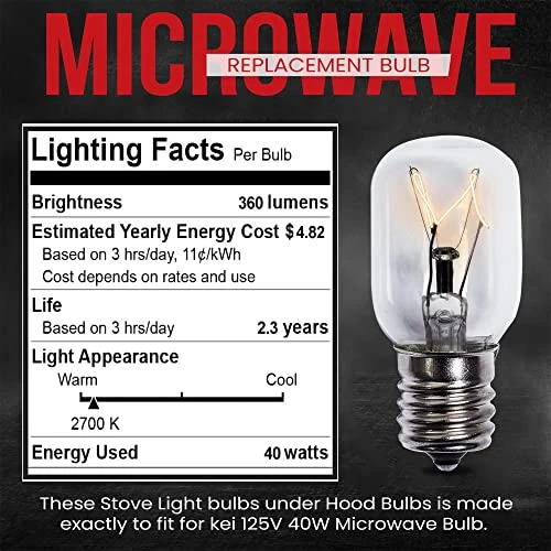 - EASY TO INSTALL: These Stove Light bulbs under Hood Bulbs is made exactly to fit for kei 125V 40W Microwave Bulb. These are replacements Compatible with most top name Brands and Fit Whirlpool, GE, Kenmore, LG, Amana, Maytag, KitchenAid, Magic Chef, Estate, Jenn-Air, Roper, Caloric, Hardwick Microwave Bulbs.