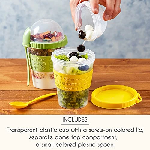 - ERGONOMIC DESIGN CUP with SPOON: 20 oz yogurt cereal on the go Cup with Spoon. Safety Cover to prevent overflowing of the beautiful mixes you have prepared. Durable and light-weight plastic cup with a screw-on colored lid, separate dome top compartment, and a small colored plastic spoon.