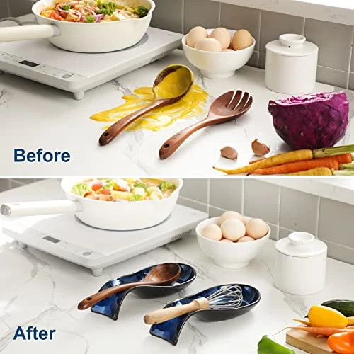 - 【KEEP YOUR KITCHEN TIDY】 The unique shape allows the cooking spoon holder to collect all drips and sauces from kitchen utensils, protecting your kitchen countertops and cooktops from mess and dirt