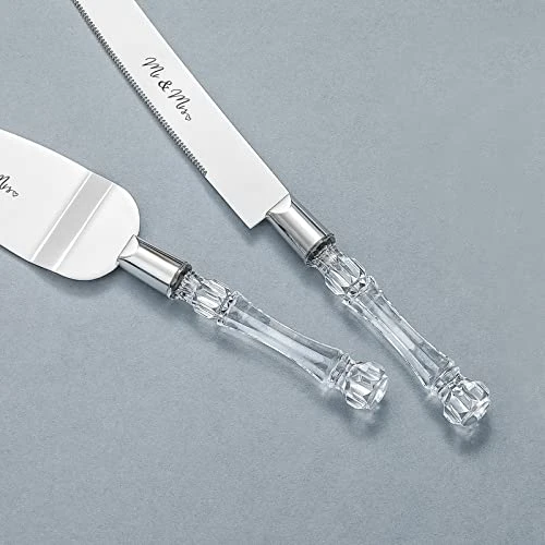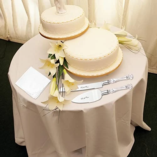 - Gift Set Details: Cake Server is 10.8 inch long, Cake knife is 13.2 inch long. Imitated crystal handles with stainless steel blades. White Lace Handkerchief is 10 inch*10inch .