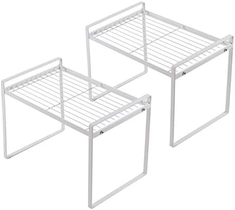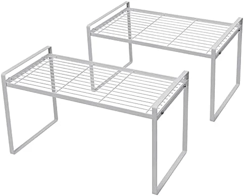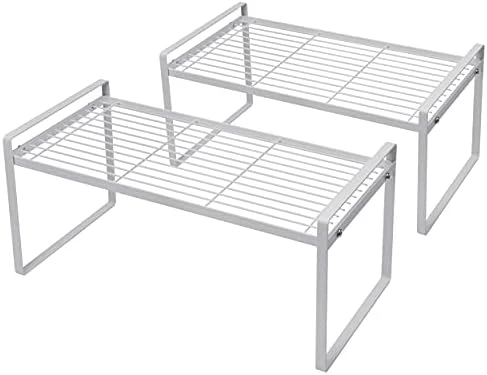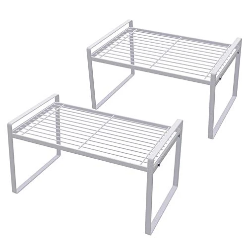 - EXTRA SPACE: These stackable cabinet shelves maximize storage efficiency, providing more spaces as a riser which allows you to use the upper space. The added storage space helps organization and tidiness. All the wee little bottles, tins, vials, pans and a myriad of other kitchen utensils could go underneath, the middle or the top of the cabinet shelf, reaching with ease.