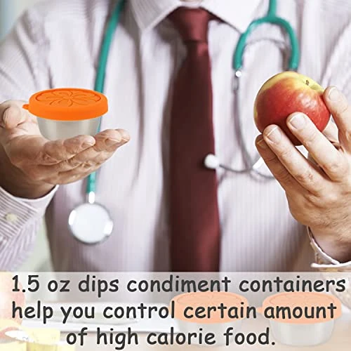 - KEEP HEALTHY HABITS. It’s hard to control your appetite in the face of delicious food. But our 1.5oz salad dressing container to go with portion control can help you! Small-capacity reusable sauce cups with lids allow you to eat certain amount of jams, sauces, nuts and snacks etc.