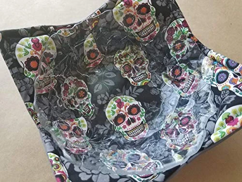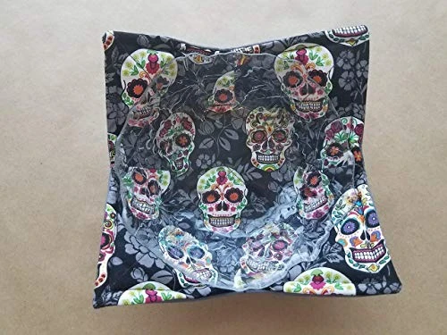 This listing is for one reversible sugar skull microwave bowl cozy. It will be perfect to keep your hands safe when eating hot food. This microwave bowl cozy features a fun all over sugar skull print on one side and solid grey on the other of the fully reversible bowl. Two layers of 100% cotton batting in-between the fabric layers keep your hands cool and your food hot. This microwave cozy measures approximately 7.5 inches square and fits standard size soup or cereal bowls. NEVER burn your fingers removing a hot bowl from the microwave ever again. This Microwave Bowl Cozy goes right in the microwave with your bowl inside! When your food is warmed up, remove the bowl using the tabs on the cozy, protecting your fingers from the hot bowl inside. Works great for cold foods as well. Protects your hands and your table from both heat and cold. Even works great to keep little hands safe! * Do NOT heat the microwave bowl cozy without a bowl inside.* * Do NOT use your microwave bowl cozy for longer than 2 minute time intervals without double checking the temperature of the cozy.*