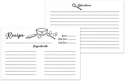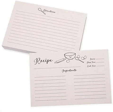 - LOTS OF ROOM TO WRITE YOUR FAVORITE RECIPES: The 4 x 6 index cards have enough space to list down all the ingredients and directions for preparing and cooking your favorite recipes. Each card also has space for noting the number of servings, prep time and cook time. You can easily make personalized recipe cards that you can share with your family and friends.