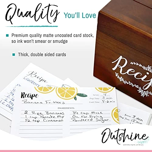 - DESIGN AND QUALITY YOU’LL LOVE: Create your own recipe book with our fruit recipe card set that includes 25 lemon and 25 orange hand-drawn designs. While others are made using coated paper that smudges your writing, our recipe cards are smear-proof as they’re made from premium quality matte uncoated 4×6 cardstock to keep your recipes legible for decades.