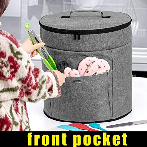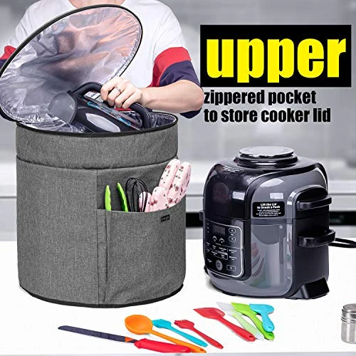 - STORAGE SECTIONS: An upper zippered pocket to store the pressure cooker lid and other accessories (Note: Please take the lid out of the upper pocket when you not cover the pressure cooker). A front pocket to keep cookbook and other utensils.