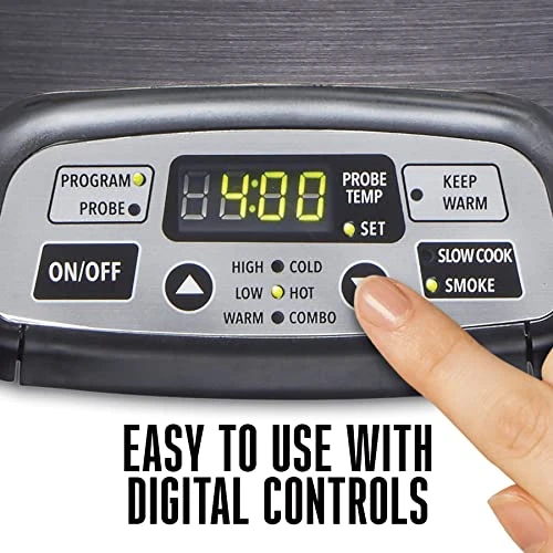 - EASY TO USE: The digital controls are simple to use. Choose from 3 smoke settings or slow cook your meal on Low or High. Just set the timer, and the slow cooker automatically switches to Warm when cooking is complete, or it turns off when cold smoking.