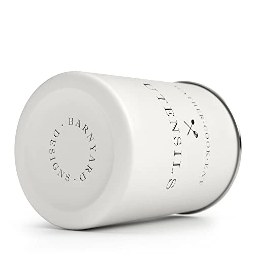 White Utensil Holder For Kitchen Countertop, Farmhouse Metal Utensil Crock, Rustic Country Decorative Kitchen Utensil Caddy Large, 5.5×6.75