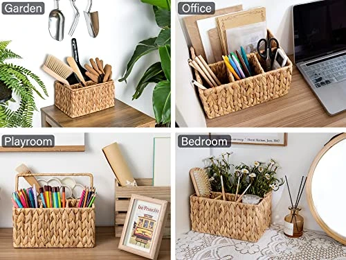 - Wicker basket with handle built on the top frame for easy portability.