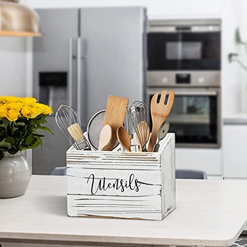 - 【Elegant Design & High Quality Material】Our kitchen utensil organizer is made of 100% solid wood. Open top design ensures utensils are always visible and accessible.Never dig through a kitchen drawer organizer to find your favorite essentials again. The cooking utensil holder adds rustic farmhouse atmosphere with its original wood texture. The farmhouse utensil crock is practical as well as decorative.