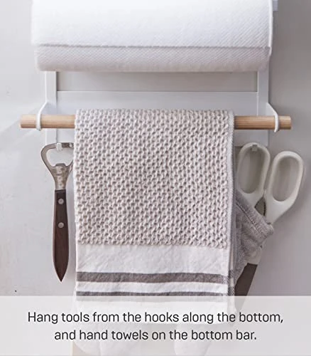 - FUNCTIONAL: Hang tools from the pegs along the bottom, cloth hand towels on the bottom bar, paper towels from the middle bar, and spices, cookbooks, and anything else you need on the top shelf and wooden support bracket.